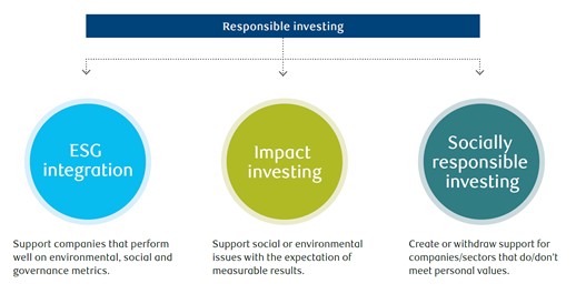 Responsible investing is an umbrella term encompassing the three approaches used to deliberately incorporate environmental, social, and governance (ESG) considerations into an investment portfolio, which are outlined below: