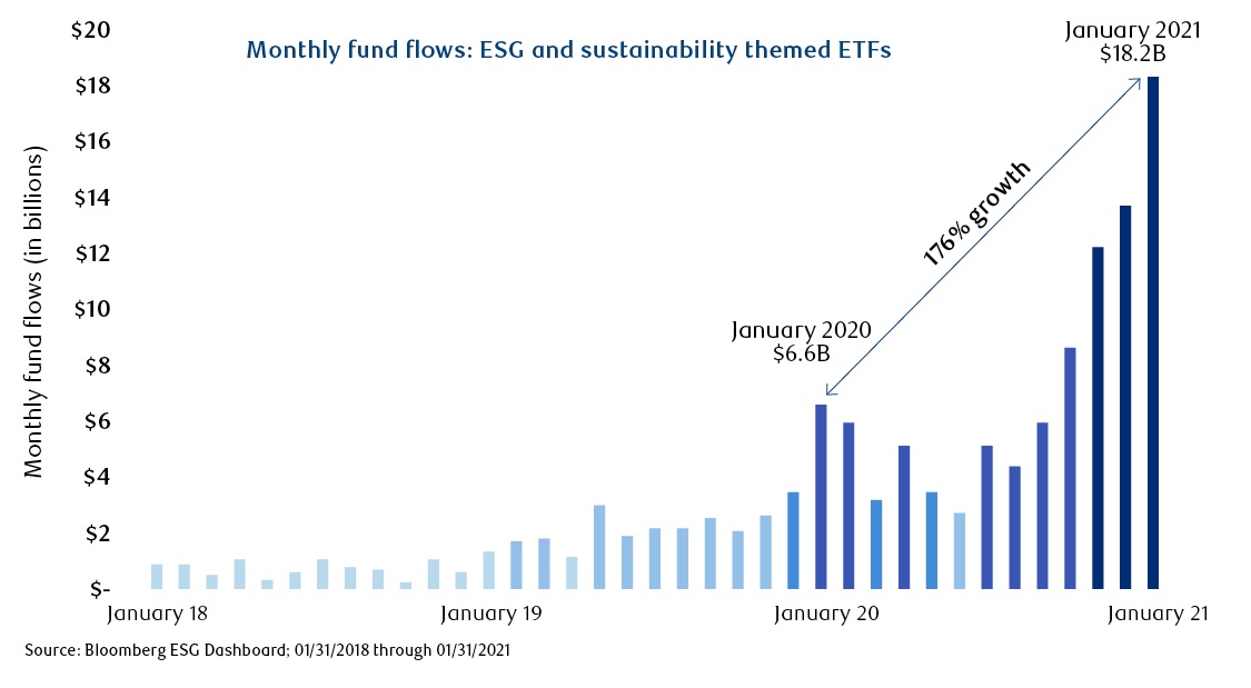 Data from Bloomberg (see chart below) shows more investors are addressing ESG concerns in their portfolios—monthly flows into ESG-focused exchange-traded funds (ETFs) jumped from $0.9 billion in January 2018 to more than $18.2 billion in January 2021, and the growth is showing no signs of slowing. To put that in perspective, total flows into equity ETFs totaled $56.7 billion in January 2021, thus ESG-focused ETFs accounted for approximately 32 percent of flows into equity ETFs that month.