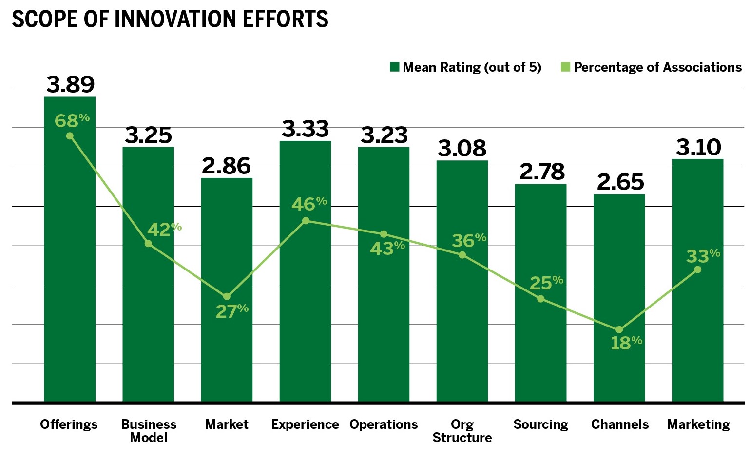 Participants in a recently released ASAE Foundation study, Associations Innovate: The Journey From Intent to Action, were asked about the scope of their innovation efforts between 2014 and 2016. Many responded that their association tended to focus on developing new programs, products, and services at the expense of innovating elsewhere. The study found that associations have lots of room for new ideas in developing new markets or market segments and new distribution channels for their offerings.