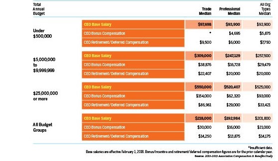 Trades pay more. The 2018 results are consistent with patterns from previous ASAE studies. On average, trade association CEOs earned at least $20,000 more than their peers at professional organizations. In addition, base salaries for CEOs, as well as bonus and deferred compensation, rose as budget size increased in all types of organizations. Here’s an overview of a few budget categories: